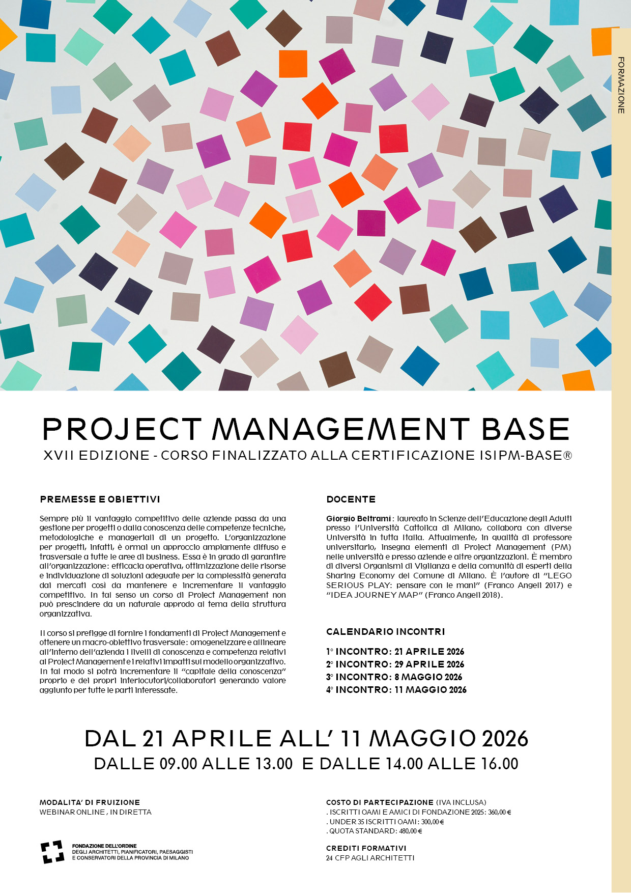 Ad aprile e maggio 2026 la Fondazione OAMi, in collaborazione con l'Ordine, ripropone il corso "Project Management finalizzato alla qualificazione ISIPM-Base®", utile a fornire le conoscenze generali e di base in materia di Project Management.