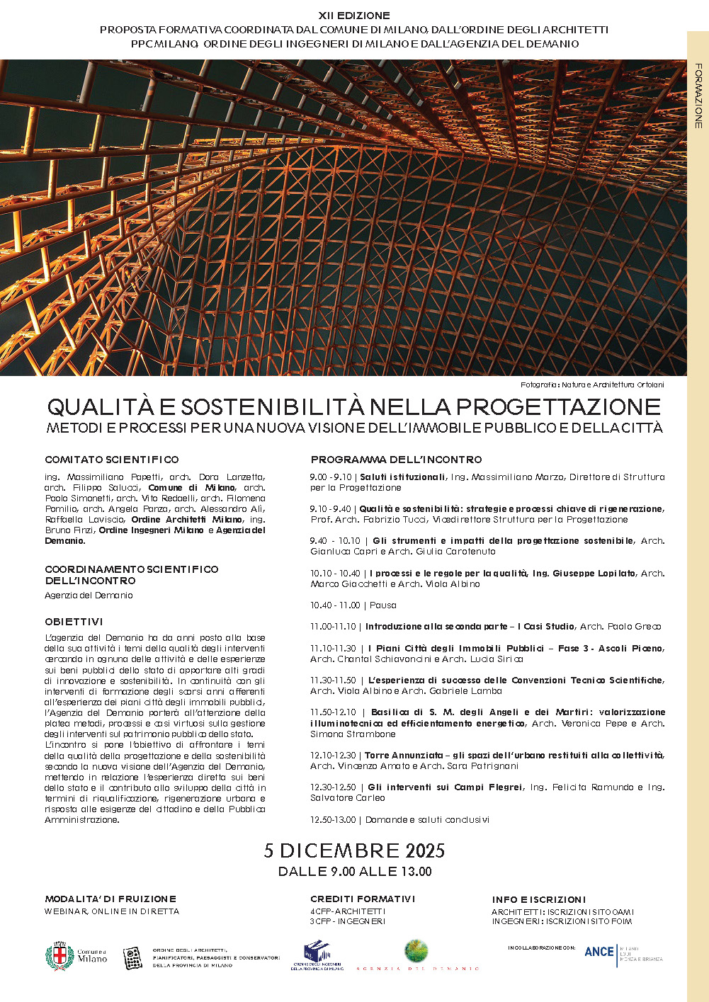 Qualità e sostenibilità nella progettazione: metodi e processi per una nuova visione dell’immobile pubblico e della città- WEBINAR (solo per gli iscritti all'Ordine di Milano) 5 dicembre 2025