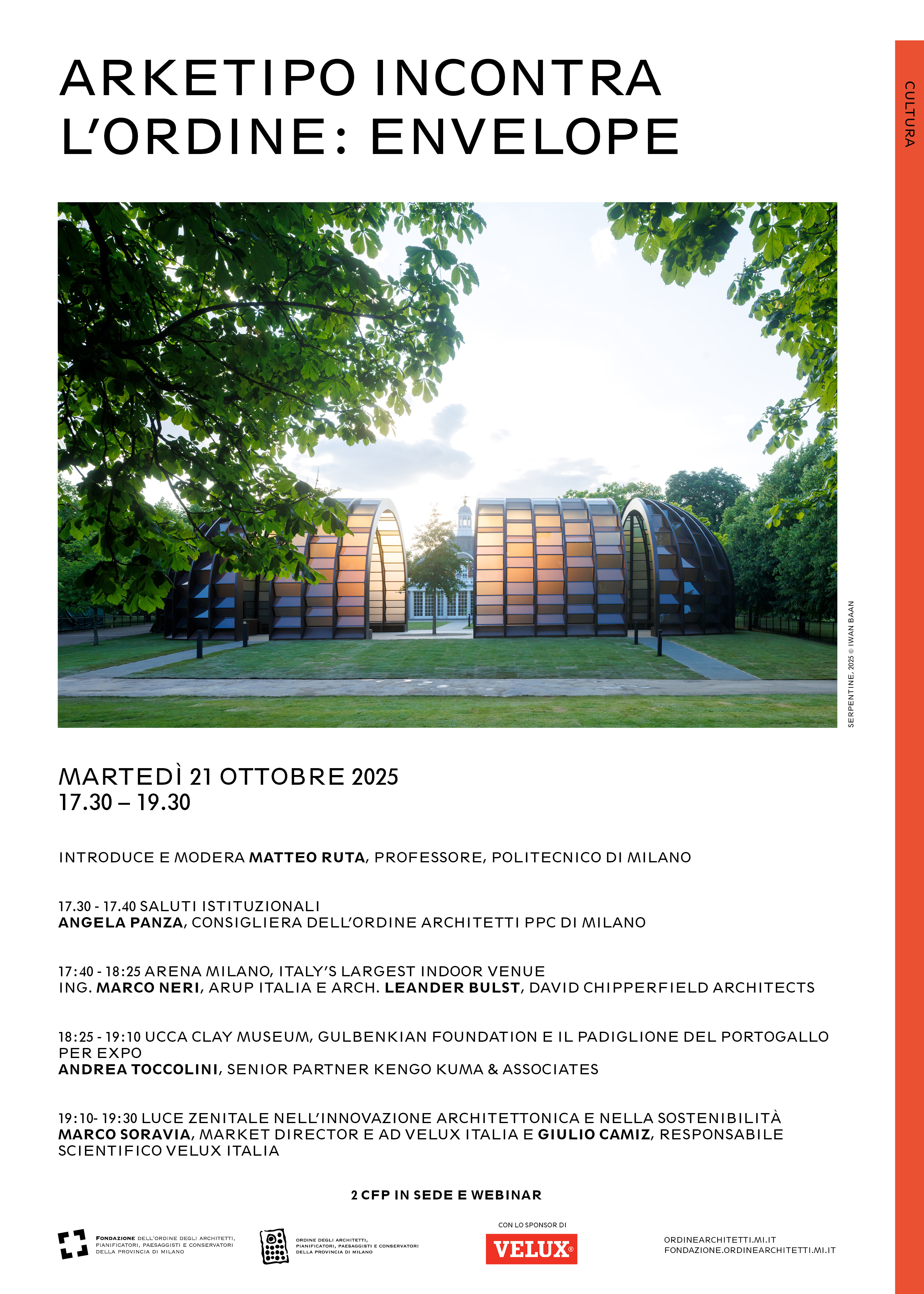 Continuano gli appuntamenti del ciclo "Arketipo incontra l'Ordine", organizzati da diversi anni da Fondazione con la rivista Arketipo, con l'obiettivo di fornire approfondimenti tecnici e culturali sui diversi aspetti della progettazione, partendo dall'analisi di progetti realizzati. L'incontro di martedì 21 ottobre 2025, sarà dedicato al tema dell'involucro architettonico.