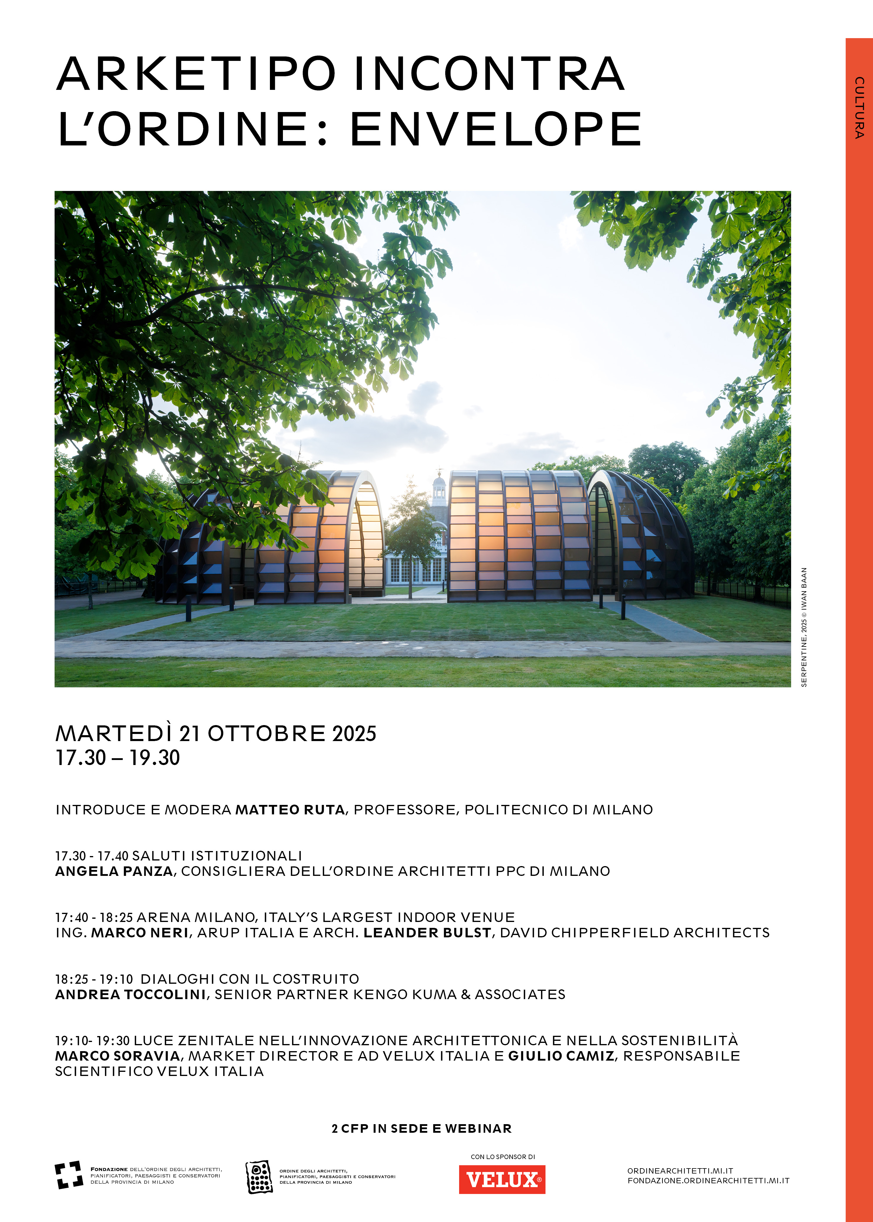 Continuano gli appuntamenti del ciclo "Arketipo incontra l'Ordine", organizzati da diversi anni da Fondazione con la rivista Arketipo, con l'obiettivo di fornire approfondimenti tecnici e culturali sui diversi aspetti della progettazione, partendo dall'analisi di progetti realizzati. L'incontro di martedì 21 ottobre 2025, sarà dedicato al tema dell'involucro architettonico.