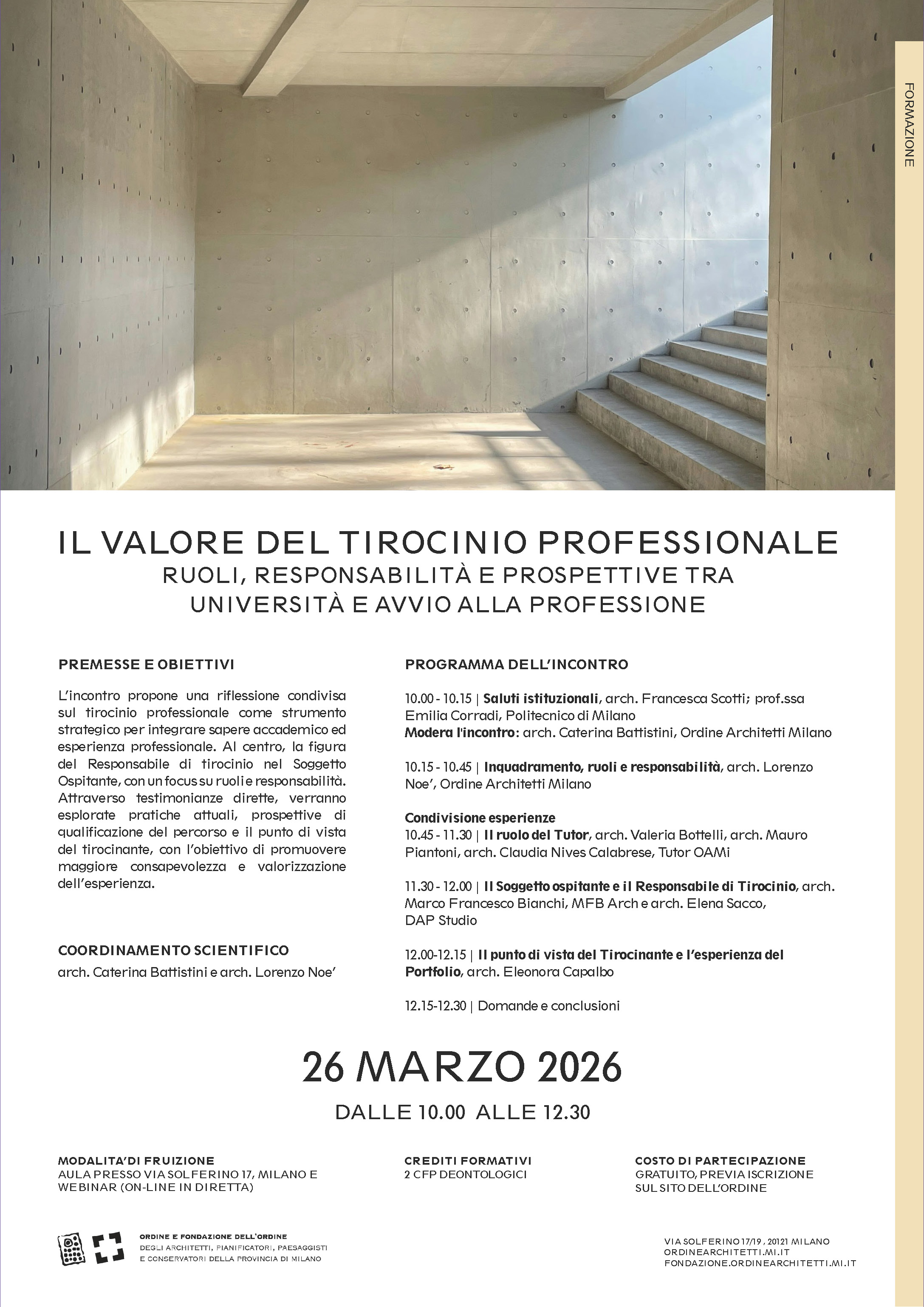 Evento gratuito, riservato agli Architetti iscritti all'Ordine di Milano, ai Responsabili di Tirocinio Professionale dell'Ordine Architetti Milano e Tirocinanti dell'Ordine Architetti PPC di Milano (in corso di svolgimento).
