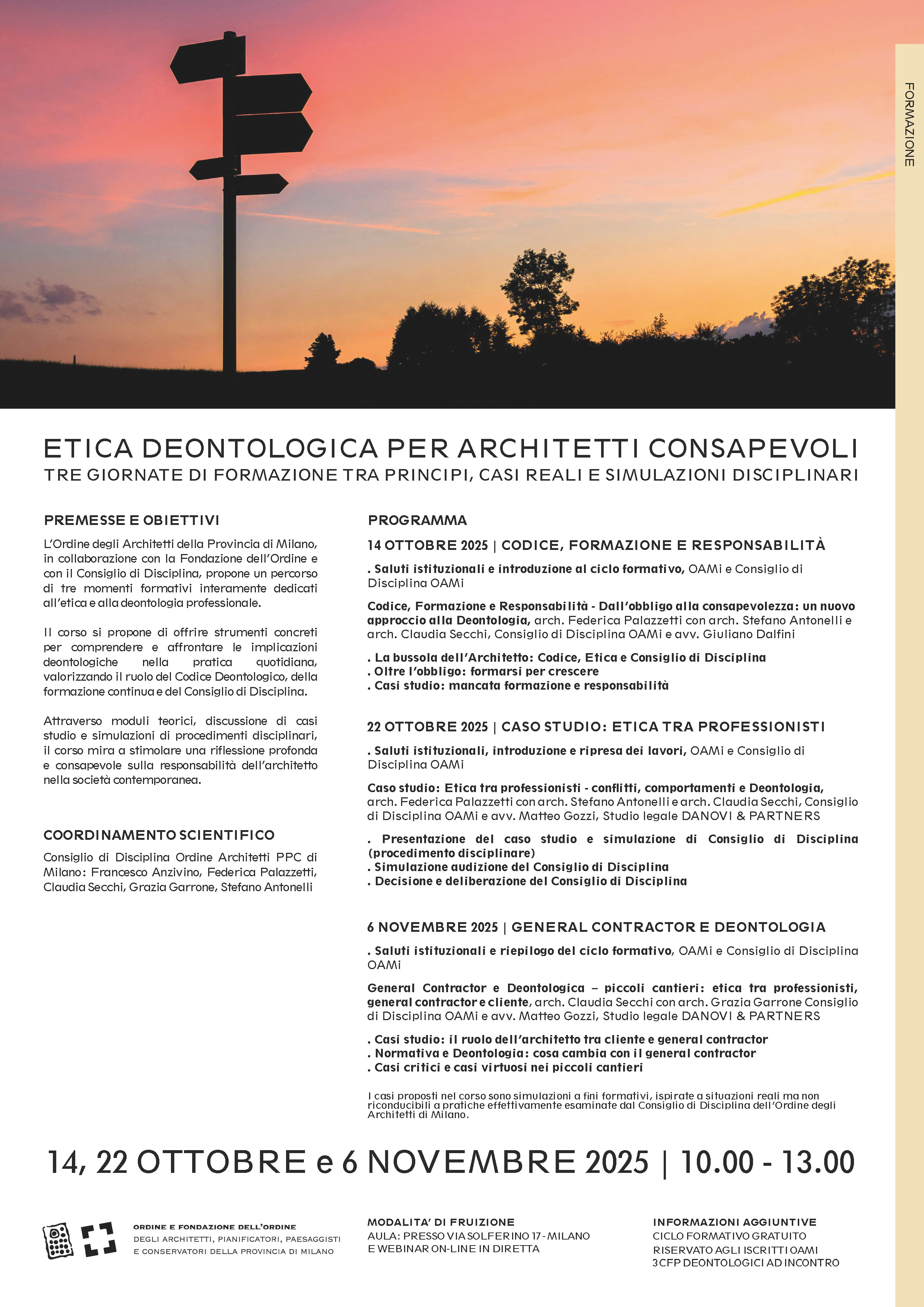 L’Ordine degli Architetti PPC della Provincia di Milano e il Consiglio di Disciplina dell’Ordine Architetti PPC di Milano propongono, nei mesi di ottobre e novembre 2025, il ciclo formativo: “Etica deontologica per architetti consapevoli”, in modalità frontale, presso la sede dell'Ordine degli Architetti PPC della Provincia di Milano (in via Solferino 17) e in webinar, online in diretta.