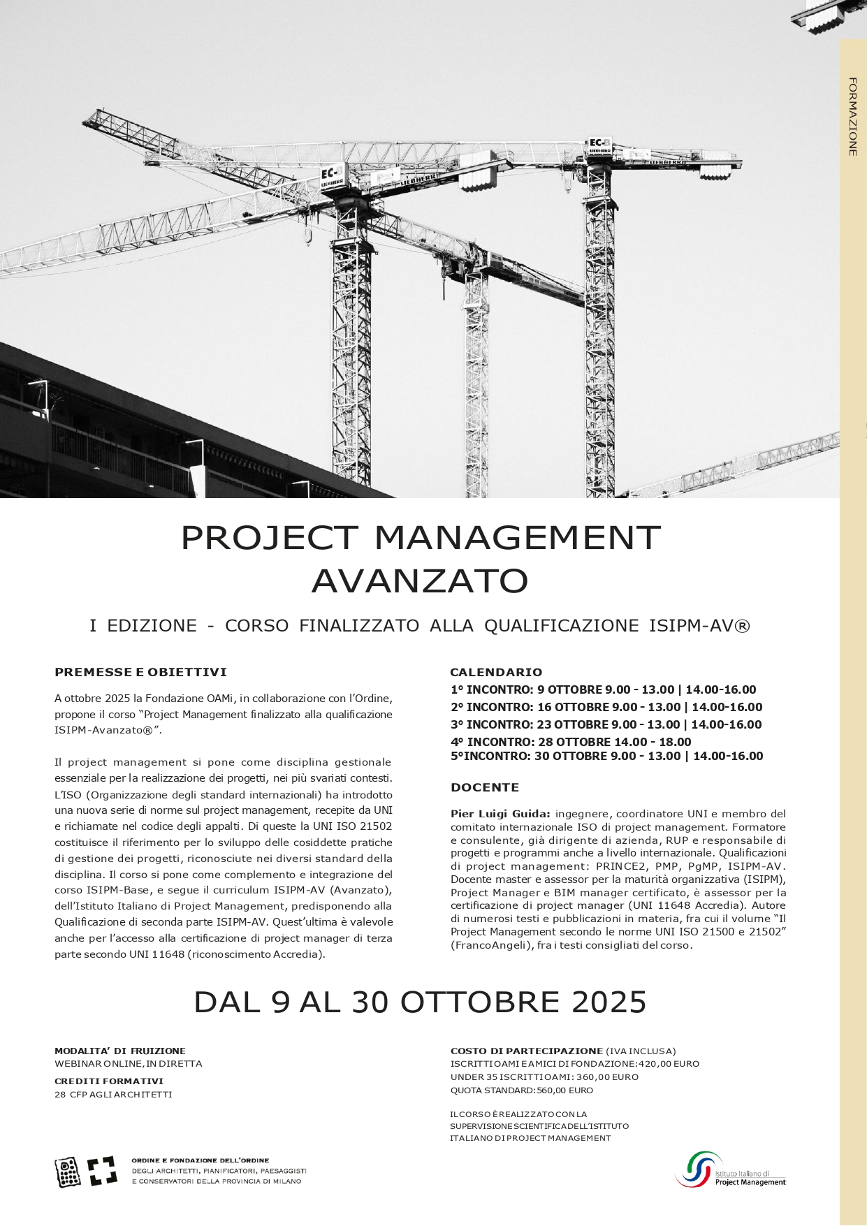 A ottobre 2025 la Fondazione OAMi, in collaborazione con l'Ordine, propone il corso "Project Management finalizzato alla Qualificazione ISIPM-Avanzato®".