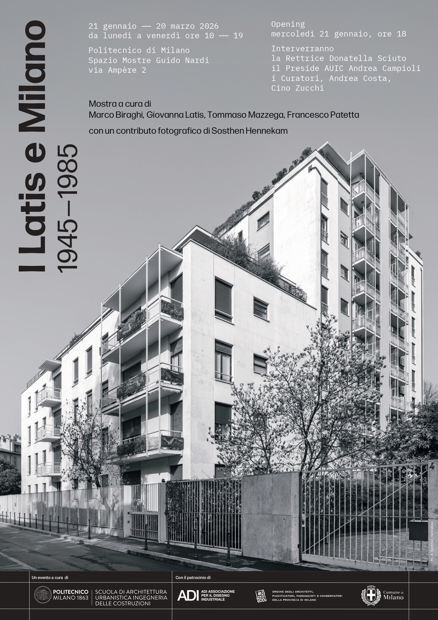 Curata da Marco Biraghi, Giovanna Latis, Tommaso Mazzega e Francesco Patetta "I Latis e Milano 1945-1985" è una mostra che, avvalendosi degli archivi privati della famiglia Latis, propone una selezione delle opere, non soltanto residenziali, realizzate dallo Studio Latis. I fratelli Vito e Gustavo sono stati due degli architetti che hanno contribuito alla ricostruzione della città di Milano gravemente bombardata durante la Seconda Guerra Mondiale.