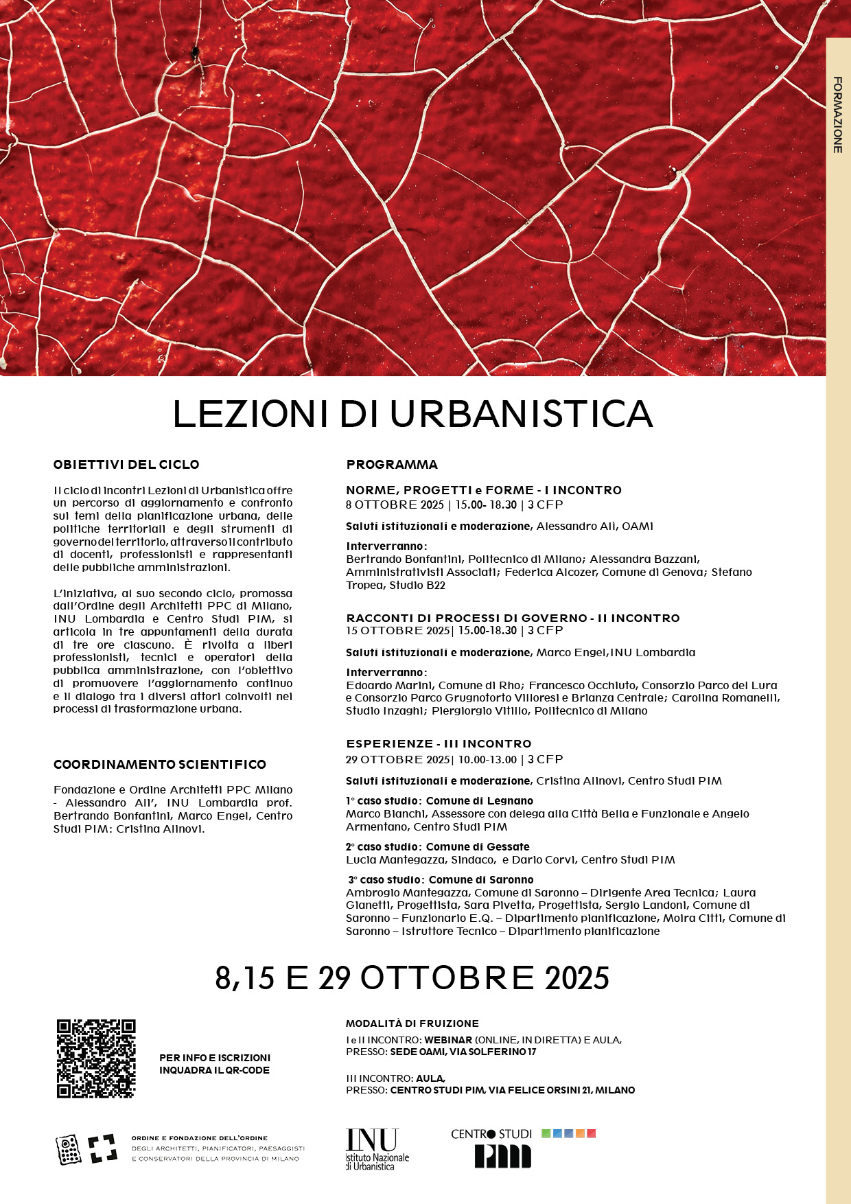 L’iniziativa, al suo secondo ciclo, promossa dall’Ordine degli Architetti PPC di Milano, INU Lombardia e Centro Studi PIM, si articola in tre appuntamenti della durata di tre ore ciascuno. È rivolta a liberi professionisti, tecnici e operatori della pubblica amministrazione, con l’obiettivo di promuovere l’aggiornamento continuo e il dialogo tra i diversi attori coinvolti nei processi di trasformazione urbana.
