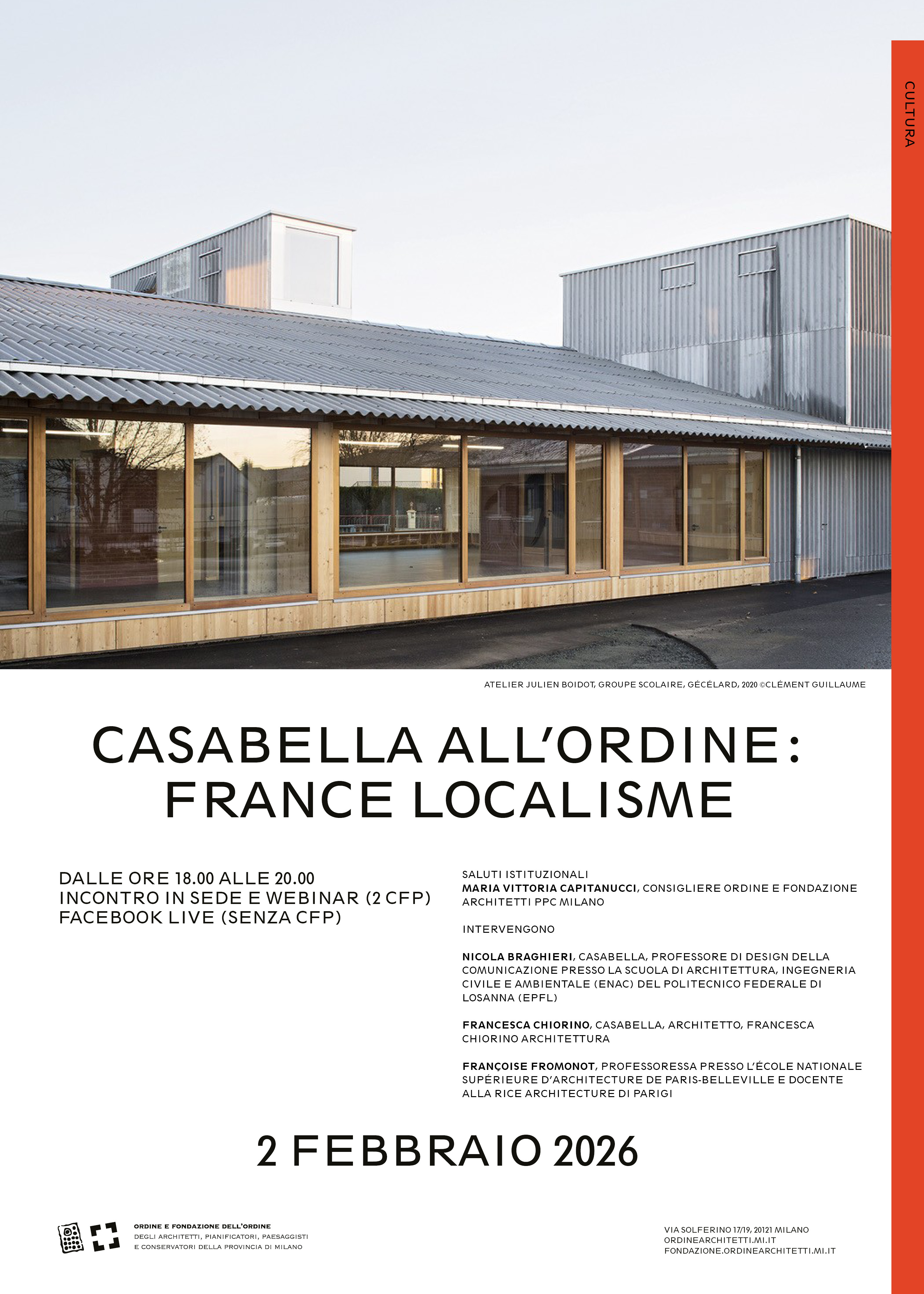 Lunedì 2 febbraio 2026, dalle ore 18 alle 20, presso la sede dell'Ordine degli Architetti PPC di Milano e in webinar, prosegue il ciclo di incontri in collaborazione con la rivista Casabella. Il secondo evento sarà dedicato all'architettura francese, occasione per presentare il numero 976 di dicembre 2025. Interverranno Nicola Braghieri, Francesca Chiorino, Françoise Fromonot. 2 cfp