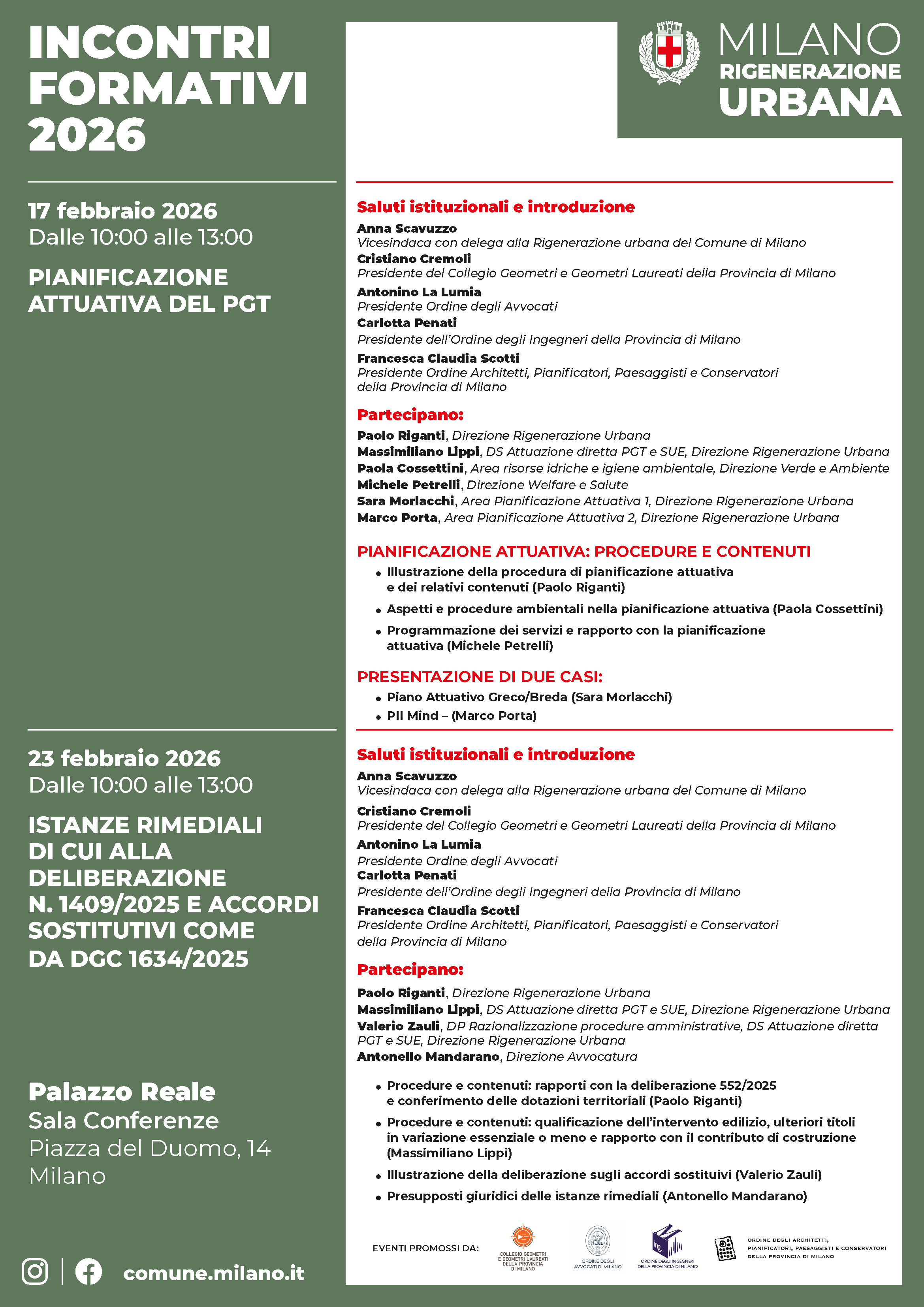 Saranno presenti: Arch. Paolo Riganti, Direzione Rigenerazione Urbana; Arch. Massimiliano Lippi, DS Attuazione diretta PGT e SUE, Direzione Rigenerazione Urbana; Avv. Valerio Zauli, DP Razionalizzazione procedure amministrative, DS Attuazione diretta PGT e SUE, Direzione Rigenerazione Urbana, Avv. Antonello Mandarano, Direzione Avvocatura.