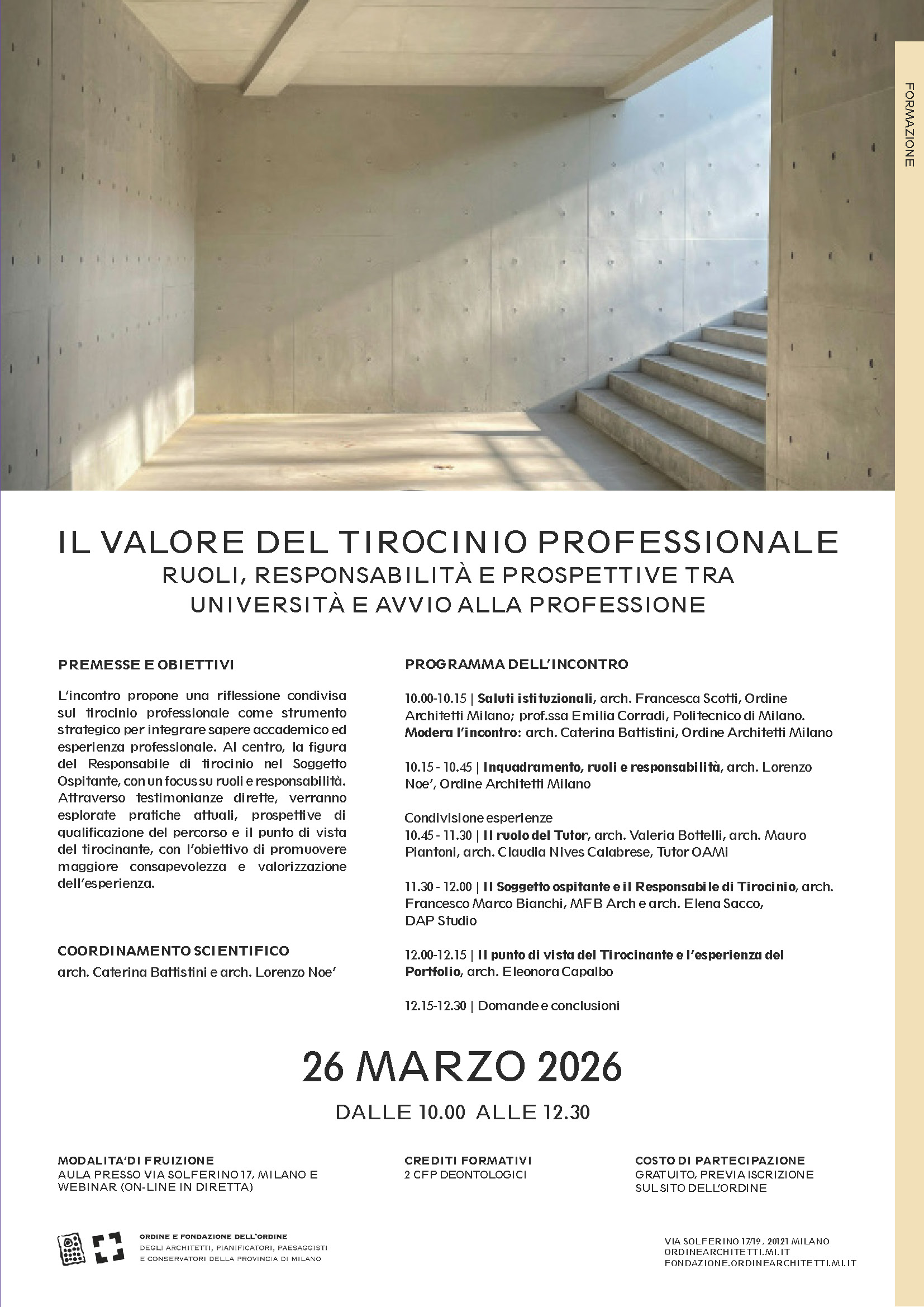 Evento gratuito, riservato agli Architetti iscritti all'Ordine di Milano, ai Responsabili di Tirocinio Professionale dell'Ordine Architetti Milano e Tirocinanti dell'Ordine Architetti PPC di Milano (in corso di svolgimento).