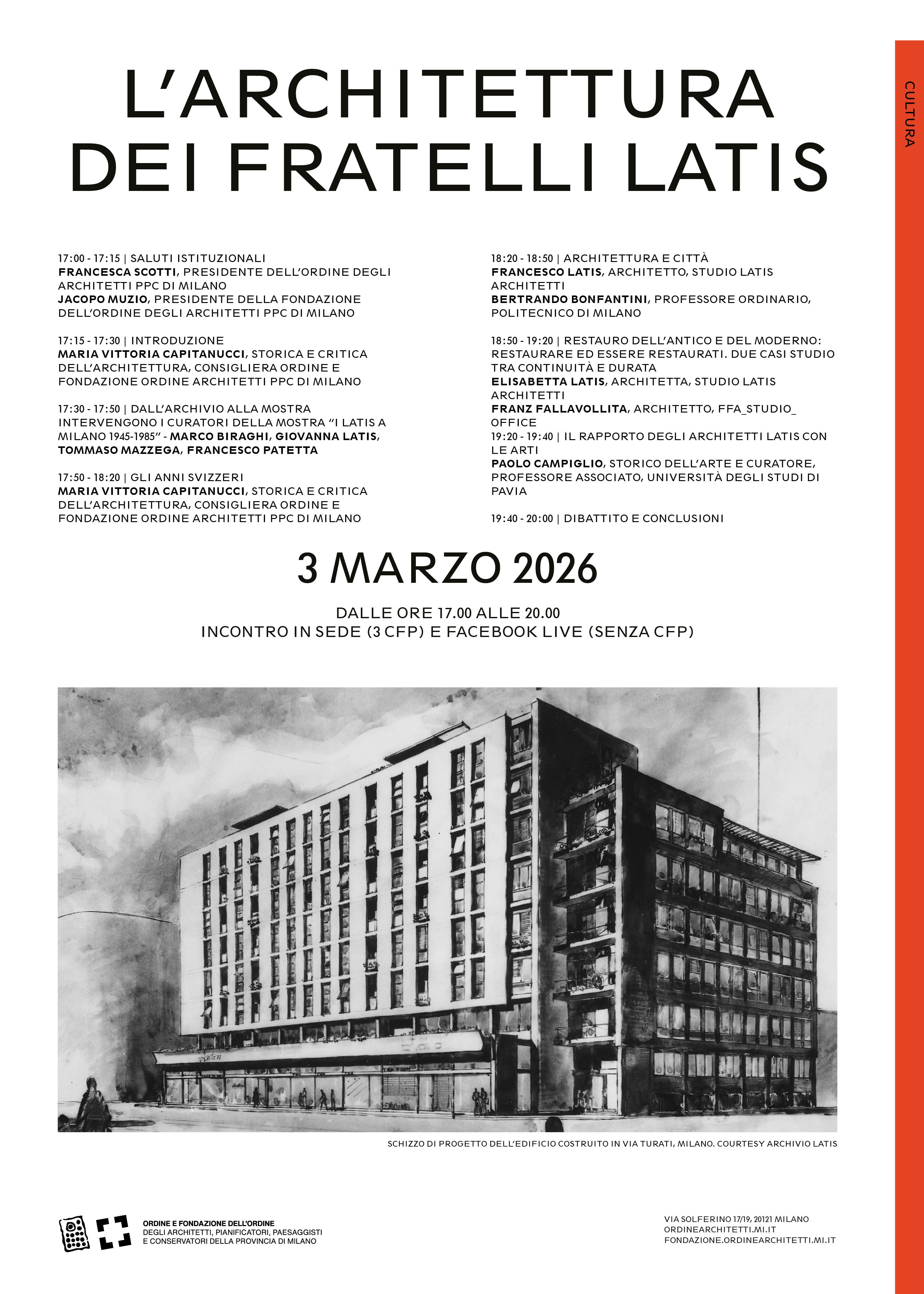 Martedì 3 marzo 2026 alle ore 17 presso la sede dell'Ordine Architetti PPC Milano, si terrà una serata dedicata alla vita professionale dei fratelli Gustavo e Vito Latis, coinvolti nel clima culturale del secondo dopoguerra milanese. Intervengono Maria Vittoria Capitanucci, Marco Biraghi, Giovanna Latis, Tommaso Mazzega, Francesco Patetta, Francesco Latis, Bertrando Bonfantini, Elisabetta Latis, Franz Fallavollita e Paolo Campiglio. 3 cfp