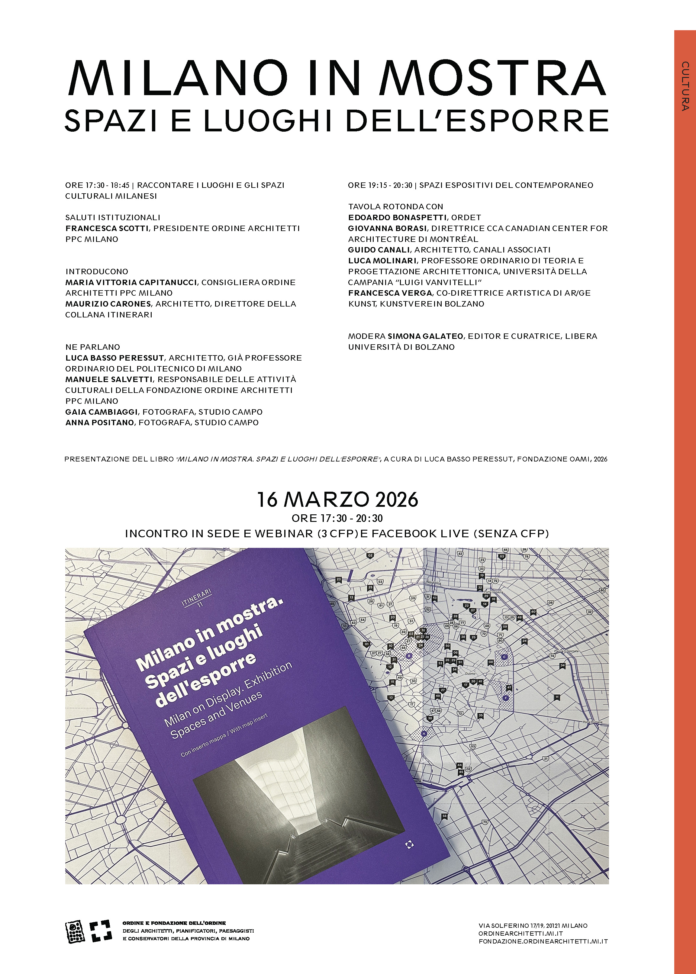 L'incontro dedicato ai luoghi della cultura milanesi è occasione di presentazione del libro "Milano in mostra. Spazi e luoghi dell'esporre", edito da Fondazione Ordine Architetti PPC Milano, che si terrà il 16 marzo alle ore 17:30 presso la sede dell’Ordine degli Architetti di Milano in via Solferino 19.