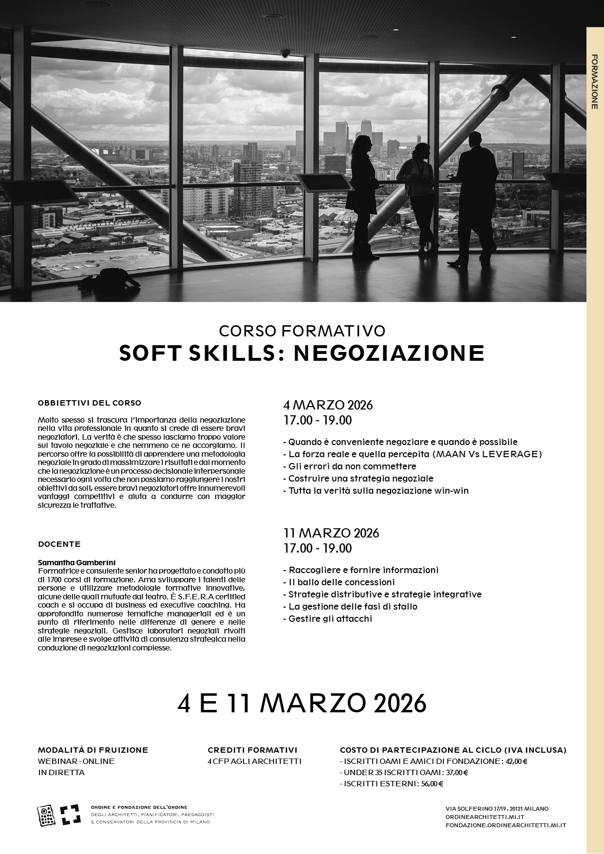 Il 4 e 11 marzo 2026, dalle 17.00 alle 19.00, è prevista una nuova edizione del corso formativo sulle "soft skills", dedicato alla valorizzazione di abilità e competenze trasversali alla professione. Guidati da Samantha Gamberini, si approfondiranno metodi e vantaggi della negoziazione.