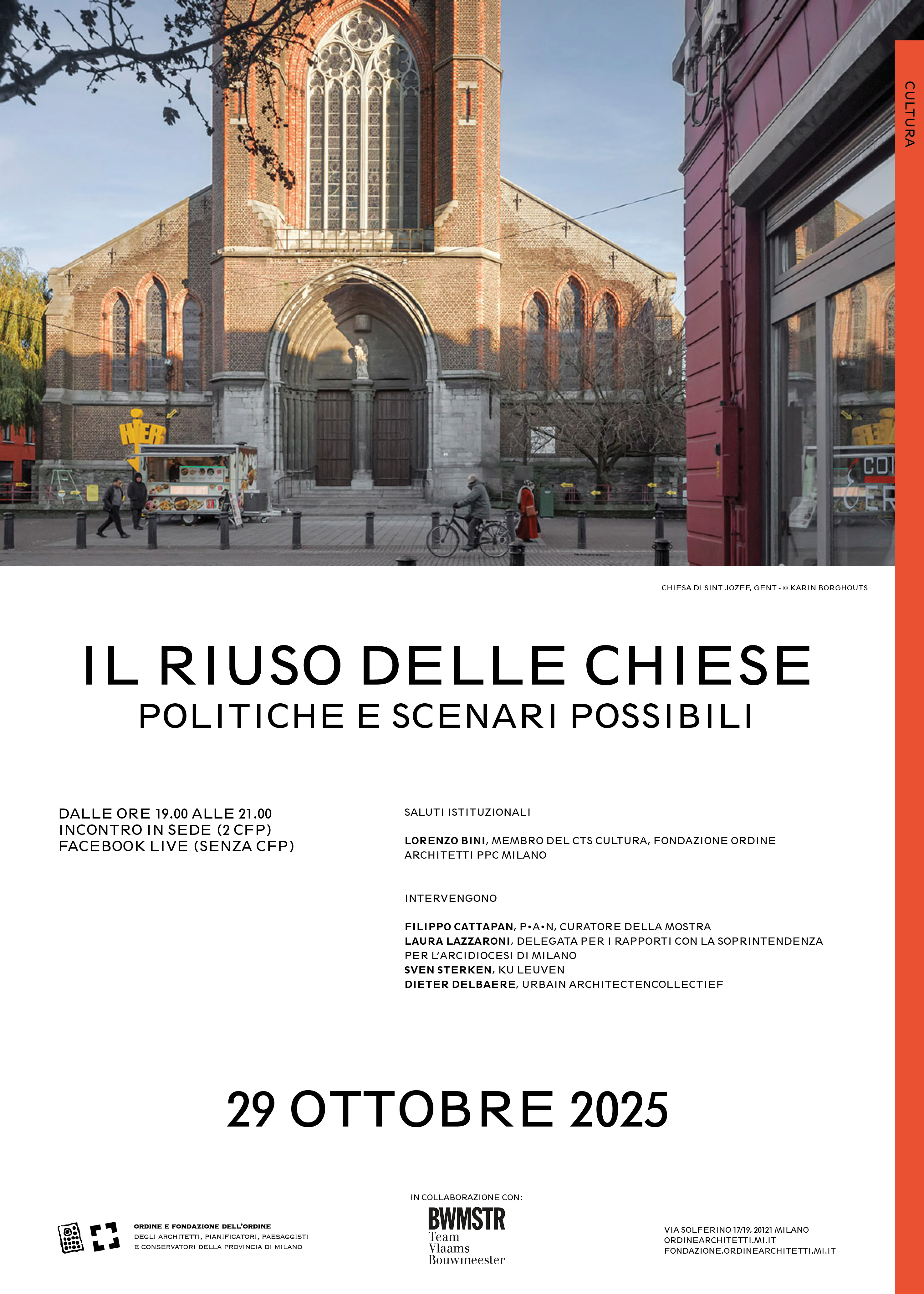 Filippo Cattapan, architetto e curatore della mostra, ne parlerà con Laura Lazzaroni, delegata per i rapporti con la Soprintendenza per l'Arcidiocesi di Milano; Sven Sterken, architetto e professore alla KU Leuven, curatore della pubblicazione Herscheppen. Ontwerpend onderzoek voor het Projectbureau Herbestemming Kerken 2016-2021 e autore del Profilo di riuso delle chiese parrocchiali per l'Agenzia del patrimonio culturale fiammingo; Dieter Delbaere, architetto di urbain architectencollectief, responsabile di uno dei sei gruppi di lavoro del Projectbureau Herbestemming Kerken e tuttora attivo con numerosi progetti in questo ambito.