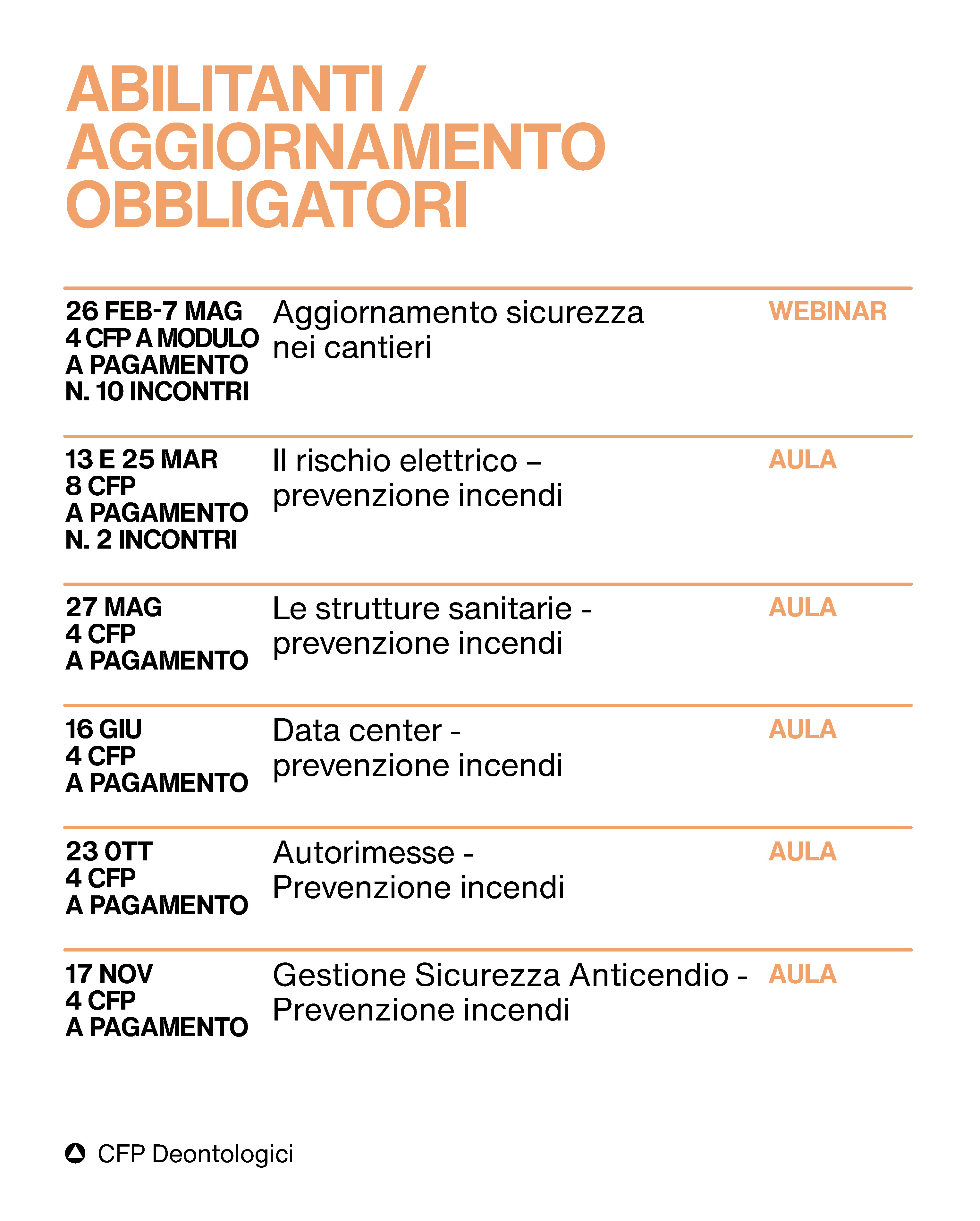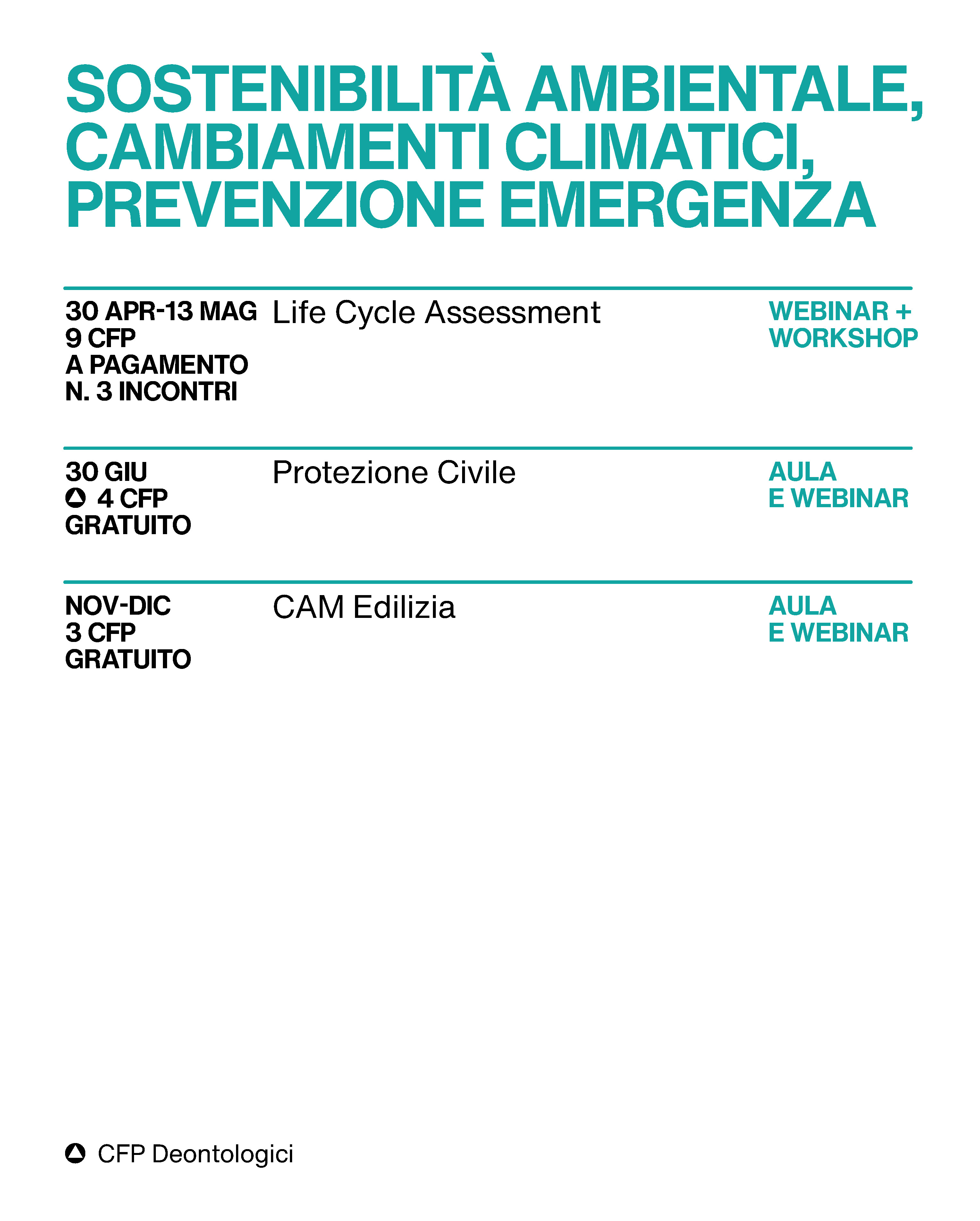 Tutti i corsi, progressivamente disponibili, vengono pubblicati sul sito dell’Ordine e della Fondazione nella sezione "Eventi formativi". I mesi di svolgimento e i CFP indicati a catalogo sono da considerarsi indicativi e potrebbero subire variazioni.