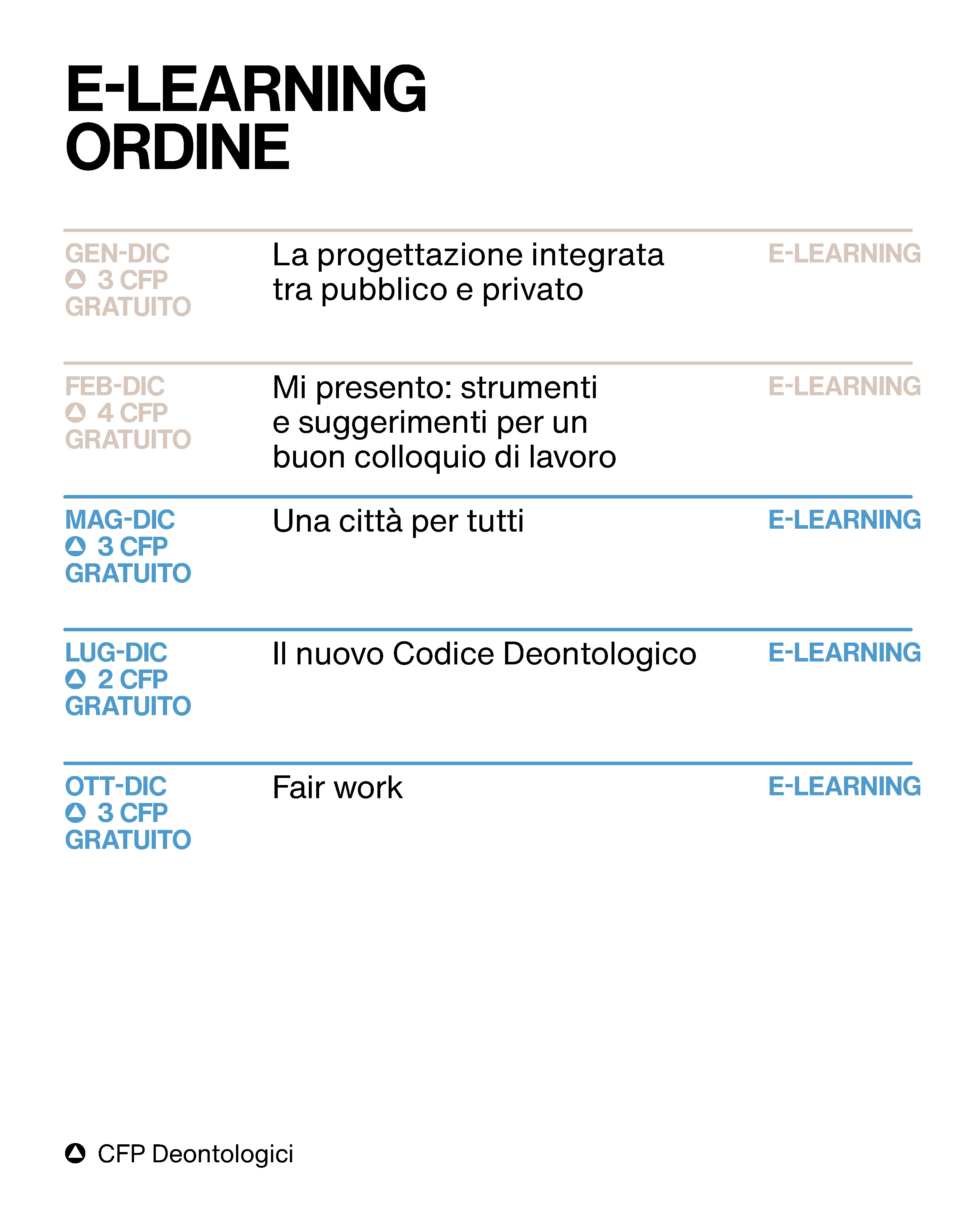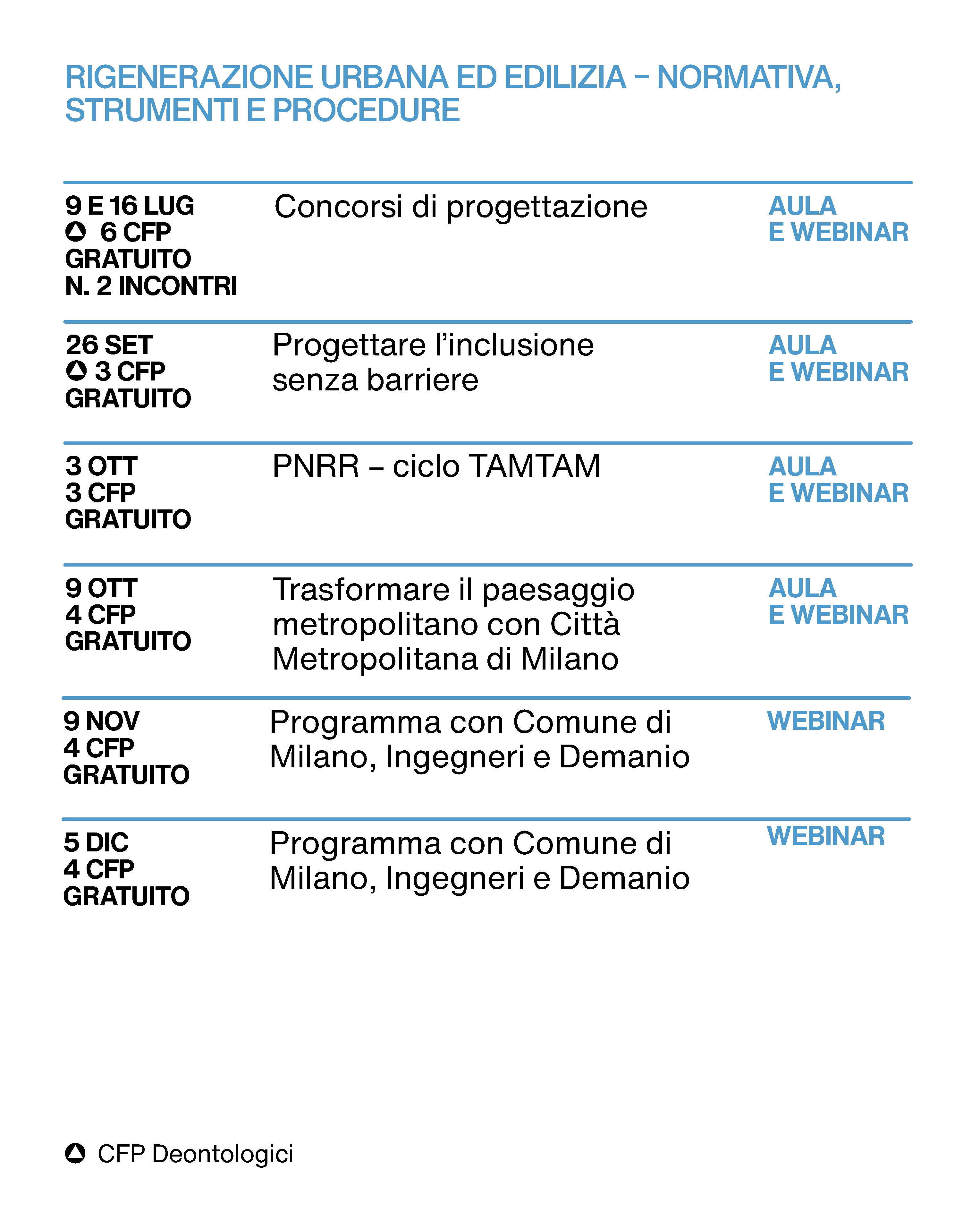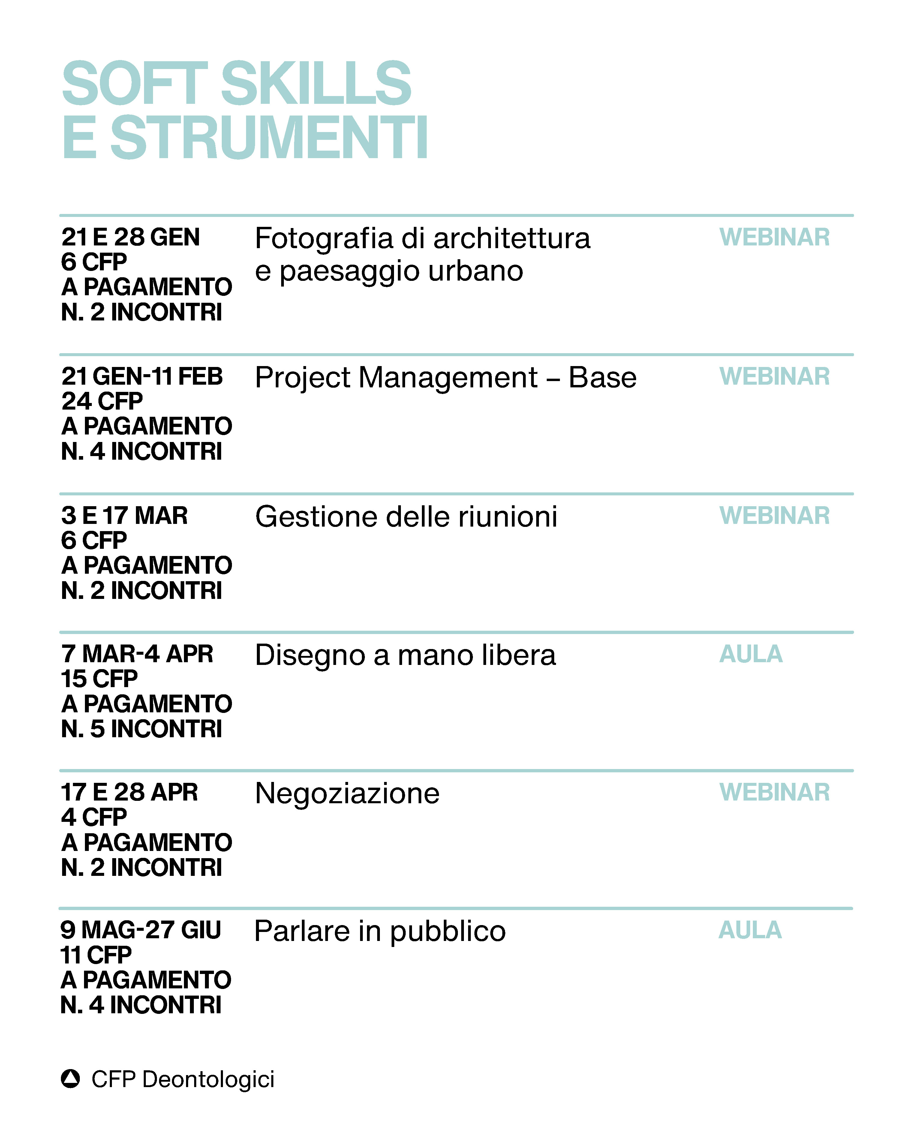 Rigenerazione urbana, progettazione, normativa, deontologia, cultura, sostenibilità, soft skills, abitare e corsi abilitanti: numerosi percorsi formativi differenziati per durata, formato e argomenti, pensati sia per professionisti affermati che per giovani architetti. Corsi, seminari e cicli di incontri con diverse fruizioni - in aula e online, in diretta e in differita, mettono a disposizione circa oltre 60 cfp gratuiti e più di 100 cfp con proposte a pagamento.