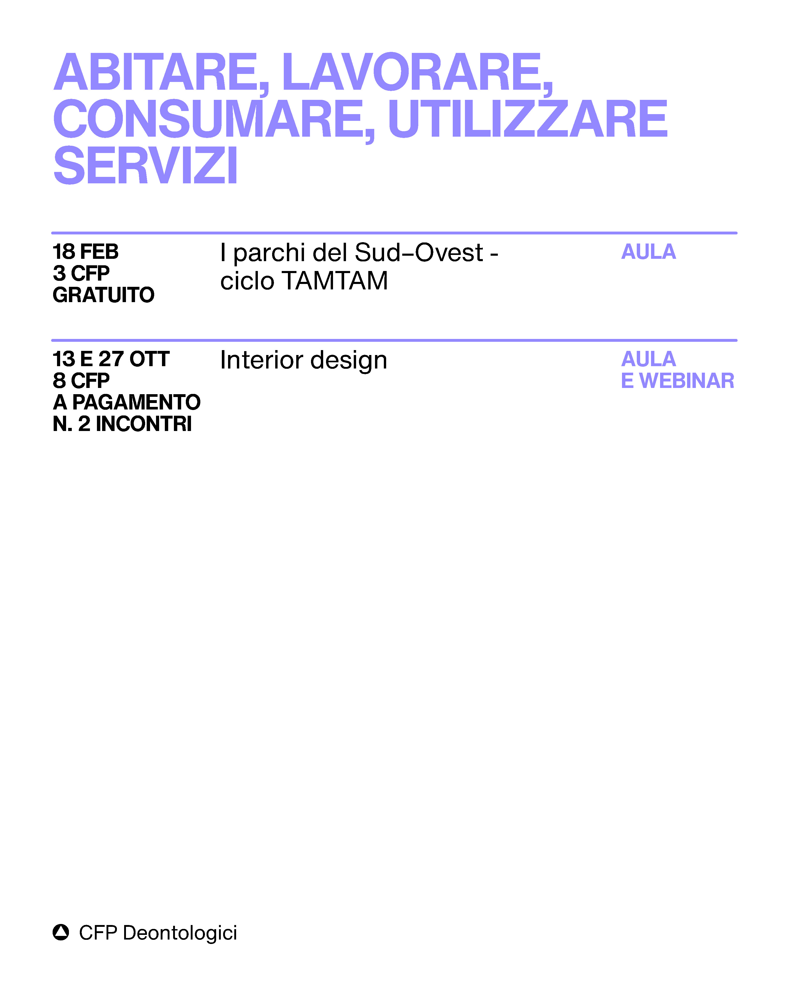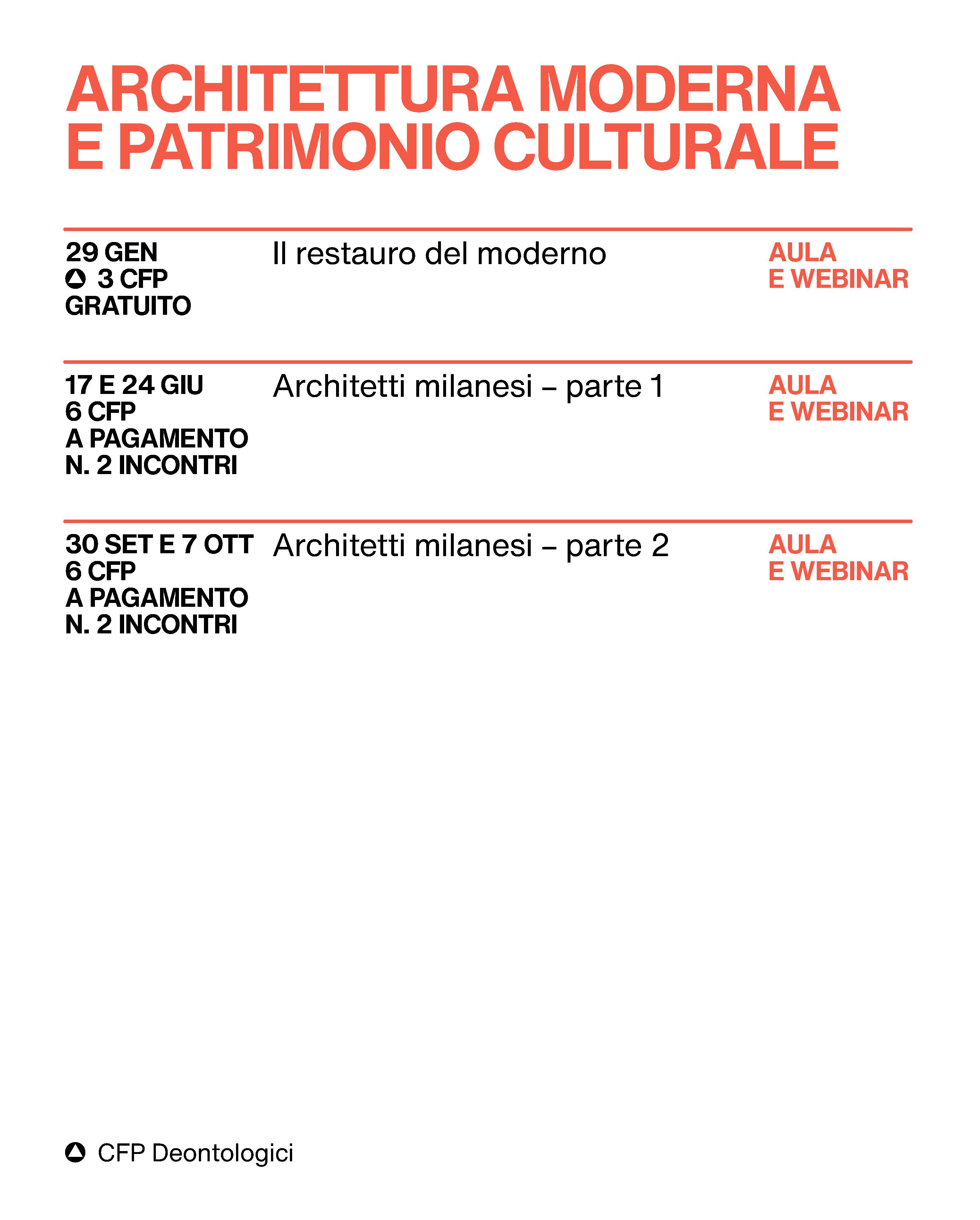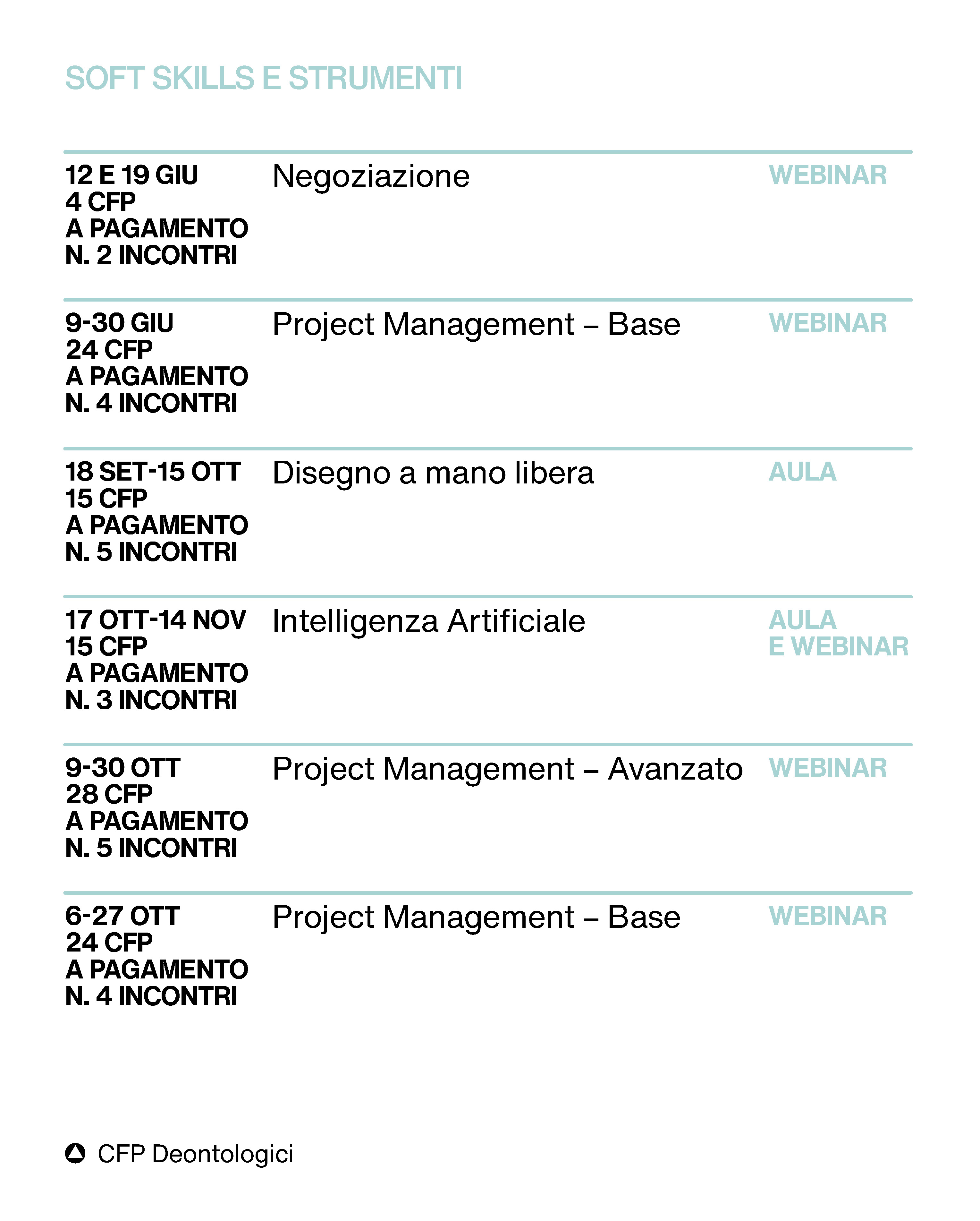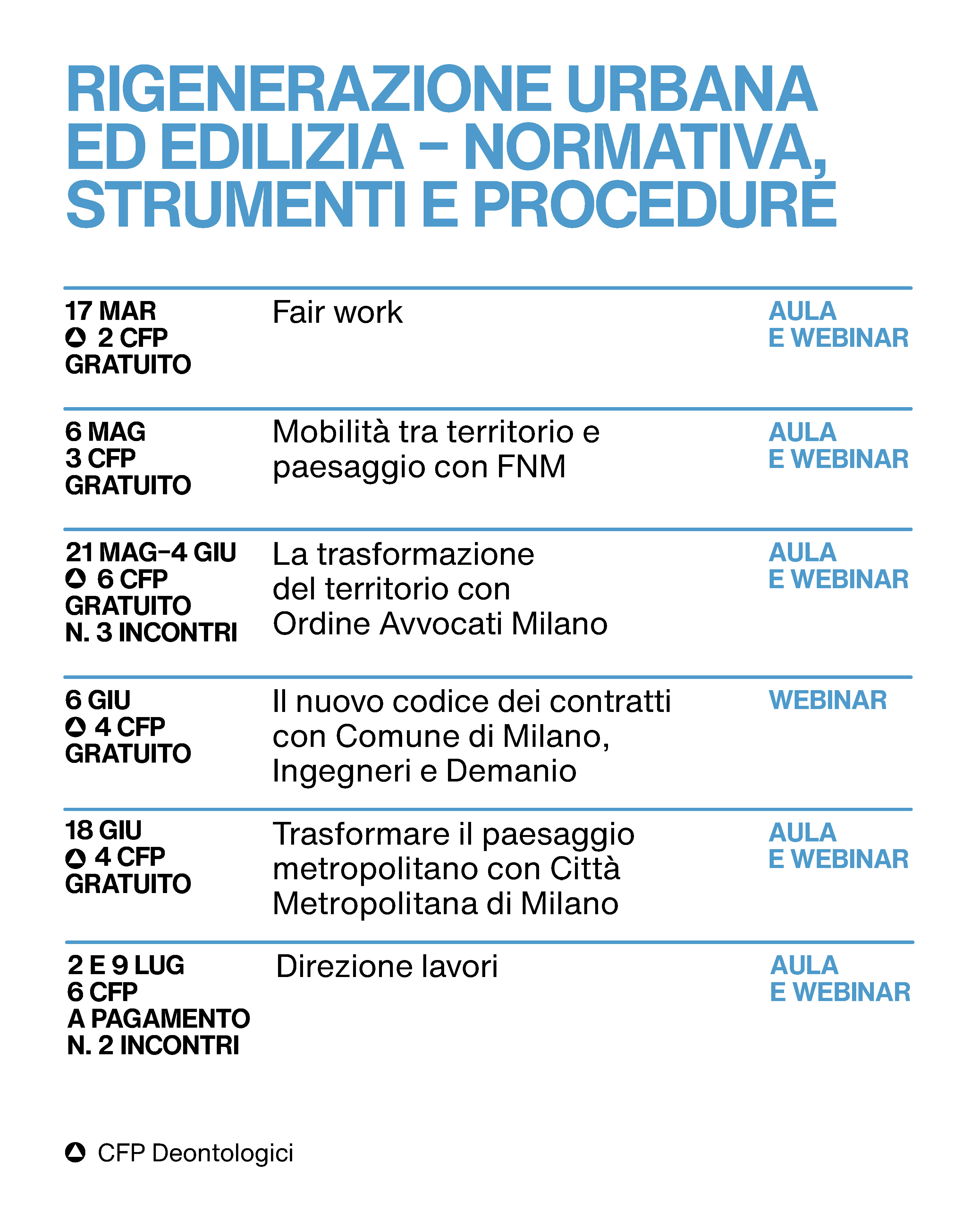 Rigenerazione urbana, progettazione, normativa, deontologia, cultura, sostenibilità, soft skills, abitare e corsi abilitanti: numerosi percorsi formativi differenziati per durata, formato e argomenti, pensati sia per professionisti affermati che per giovani architetti. Corsi, seminari e cicli di incontri con diverse fruizioni - in aula e online, in diretta e in differita, mettono a disposizione circa oltre 60 cfp gratuiti e più di 100 cfp con proposte a pagamento.