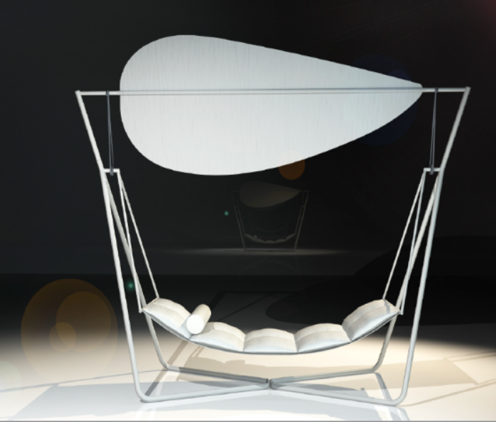 Un sistema di arredi per esterni a dondolo che usa questo movimento per creare una " lama d'aria" senza nessun consumo di energia. La lama metallica posta sopra l'amaca crea una piacevole lama d'aria.