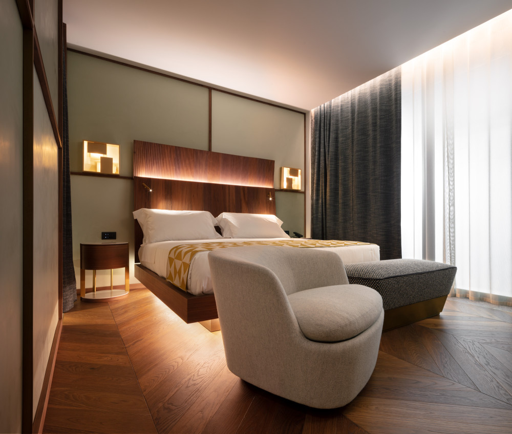 Il nuovo concept per l'Urban Hive Hotel, nato dalla riqualificazione dello storico Carlyle Hotel nel cuore di Brera, ha interessato gli spazi comuni e le 97 camere e suites distribuite su 7 piani. Le scelte per il progetto d’interni e per la soft decoration reinterpretano in chiave contemporanea la tradizione del design “alla milanese”, citando l’elegante modernità senza tempo delle opere dei Maestri del dopoguerra, oltre ai miti e ai simboli della città, dalla Madonnina al Bar Basso. Il quartiere di Brera, con la sua vocazione intellettuale e anticonformista, ha ispirato l’anima dell’hotel inteso come luogo d’incontri e socialità. Dinamico e intimo allo stesso tempo, l’Urban Hive è stato infatti concepito per trasformarsi in social hub, in un continuo scambio tra ospiti e cittadini grazie a numerosi servizi che si aprono al pubblico: dalle aree coworking multifunzionali alle meeting rooms, dagli eventi culturali ai business lunch e agli aperitivi proposti al Portico84 Cafè&Bar. Uno dei concetti chiave dell’intervento è il modo in cui sono stati disegnati gli spazi dedicati al co-working. L’hotel ha adottato una visione circolare dell’uso degli ambienti comuni, per valorizzare la superficie dando differenti destinazioni d’uso nel corso della giornata. Le 97 camere e suites sono state ridisegnate con arredi custom-made, mentre l’accurato studio sul colore ha dato vita alla scelta di tre palette differenti che si alternano sui piani delle camere - rosa terracotta, verde menta e celeste - e che nelle stanze contrastano con i tendaggi.