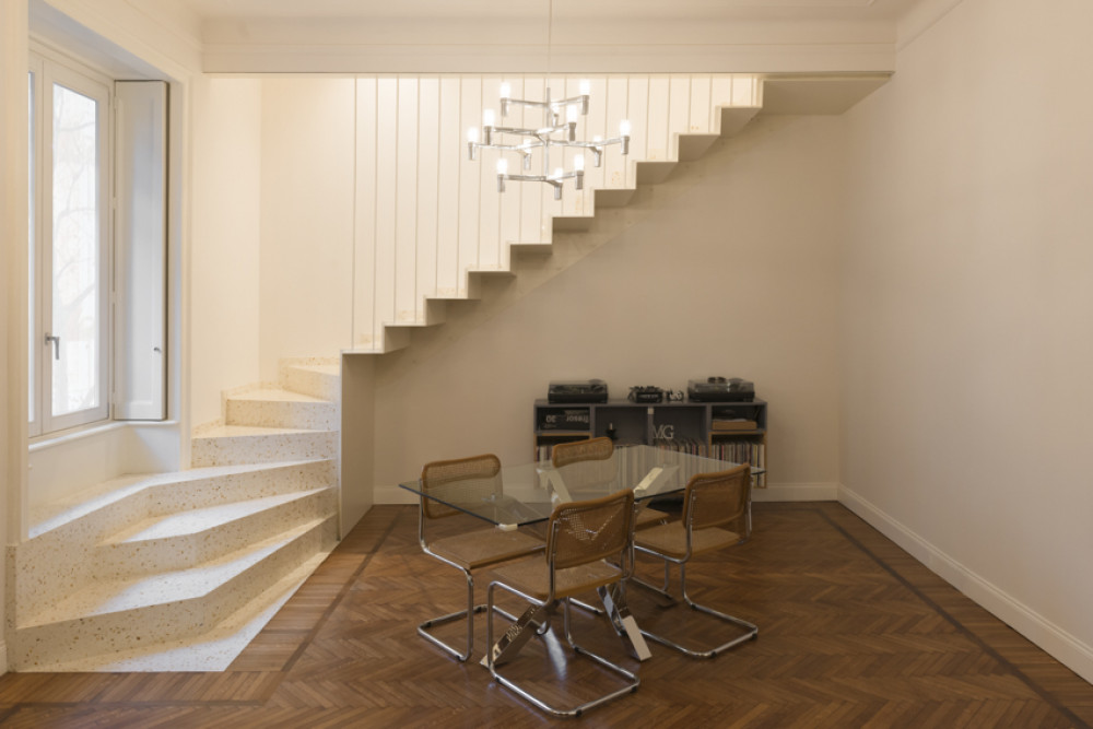 APPARTAMENTO GS8 MILANO L’intervento di ristrutturazione si colloca in un palazzo Milanese degli anni ’30 con soffitti alti, cornici in gesso, finestre con scuri interni in legno e parquet a spina di pesce. Il progetto nasce dalla necessità di unire due appartamenti sovrapposti dopo l’acquisizione di quello superiore e creare un’unica unità di oltre 170 mq in grado di ospitare una giovane famiglia. La prima richiesta della Committenza fu di studiare un elemento di collegamento tra i due livelli scenografico e al tempo stesso misurato. La scala è stata posizionata sulla parete opposta rispetto all'ingresso come il fondale di un teatro. Il risultato è una scala dall'anima contemporanea che dialoga con lo stile e la storia dell'edificio, un elemento scultoreo e fluttuante. Ogni dettaglio è pensato per enfatizzare la percezione di leggerezza, il disegno si riduce agli elementi essenziali per perseguire il costante obbiettivo di sintesi e autenticità. Il piano terra è riservato alla zona giorno, caratterizzato da un grande open space con living e sala da pranzo, risultato dell’unione della vecchia camera da letto al soggiorno. Il layout del primo piano, completamente riprogettato, ospita uno studio e la zona notte con una camera da letto padronale con bagno privato, una camera dei bambini, un terzo bagno e una lavanderia. Altro elemento caratterizzante è il lungo corridoio distributivo al primo piano. Questo, necessario considerata la conformazione dell’appartamento, si dilata grazie all’effetto ottico dell’armadiatura specchiata. Le tubazioni del riscaldamento sono state volutamente lasciate a vista per rafforzare il dialogo tra passato e presente. Analogamente le vecchie porte sono state riutilizzate e al tempo stesso rinnovate con la creazione di nuove imbotti. I toni che prevalgono solo quelli delle tinte chiare e del bianco. Il pavimento è in terrazzo come il rivestimento della scala per sottolineare la continuità tra i due piani. Un tono pastello, un sage green, compare sulle pareti del bagno. Unico elemento di rottura che da un tocco di energia è la porta scorrevole con l’arco in fondo al corridoio in india yellow. Gli elementi classici come il parquet, le tipiche porte modello Milano e le decorazioni in gesso dialogano con le nuove finiture e gli interventi sartoriali. Uno stile classico con dettagli di carattere contemporaneo, un mix tra arredi vintage e moderni, uno studio attento dell’illuminazione e della scelta dei corpi illuminati, rendono l’ambiente accogliente, famigliare e molto personale.