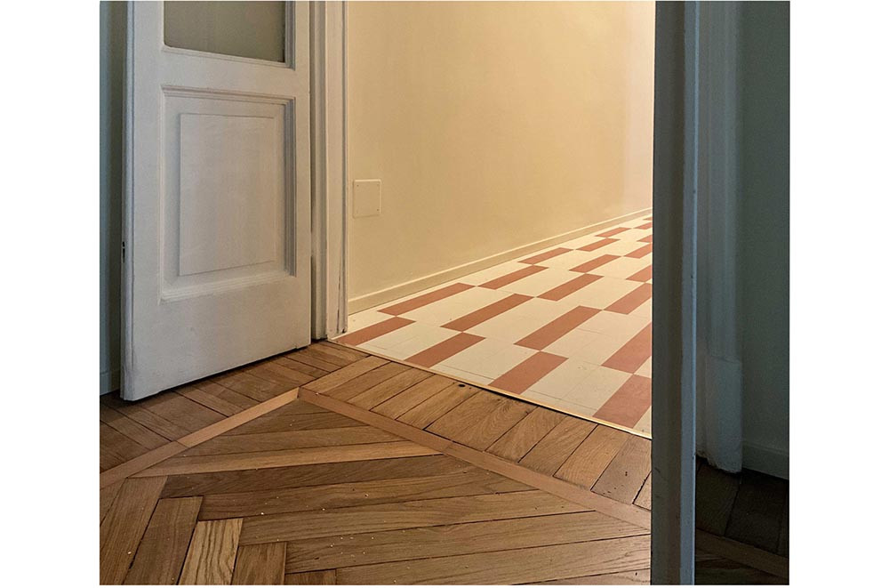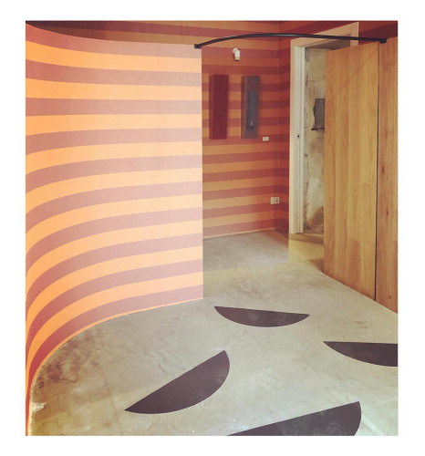 Una parete curva in legno, rivestita con carta da parati su misura, racchiude la stanza segreta di uno showroom dedicato a finiture e rivestimenti d’interni. Visibile dalla strada, nella vetrina, rimane nascosta all’interno del negozio.