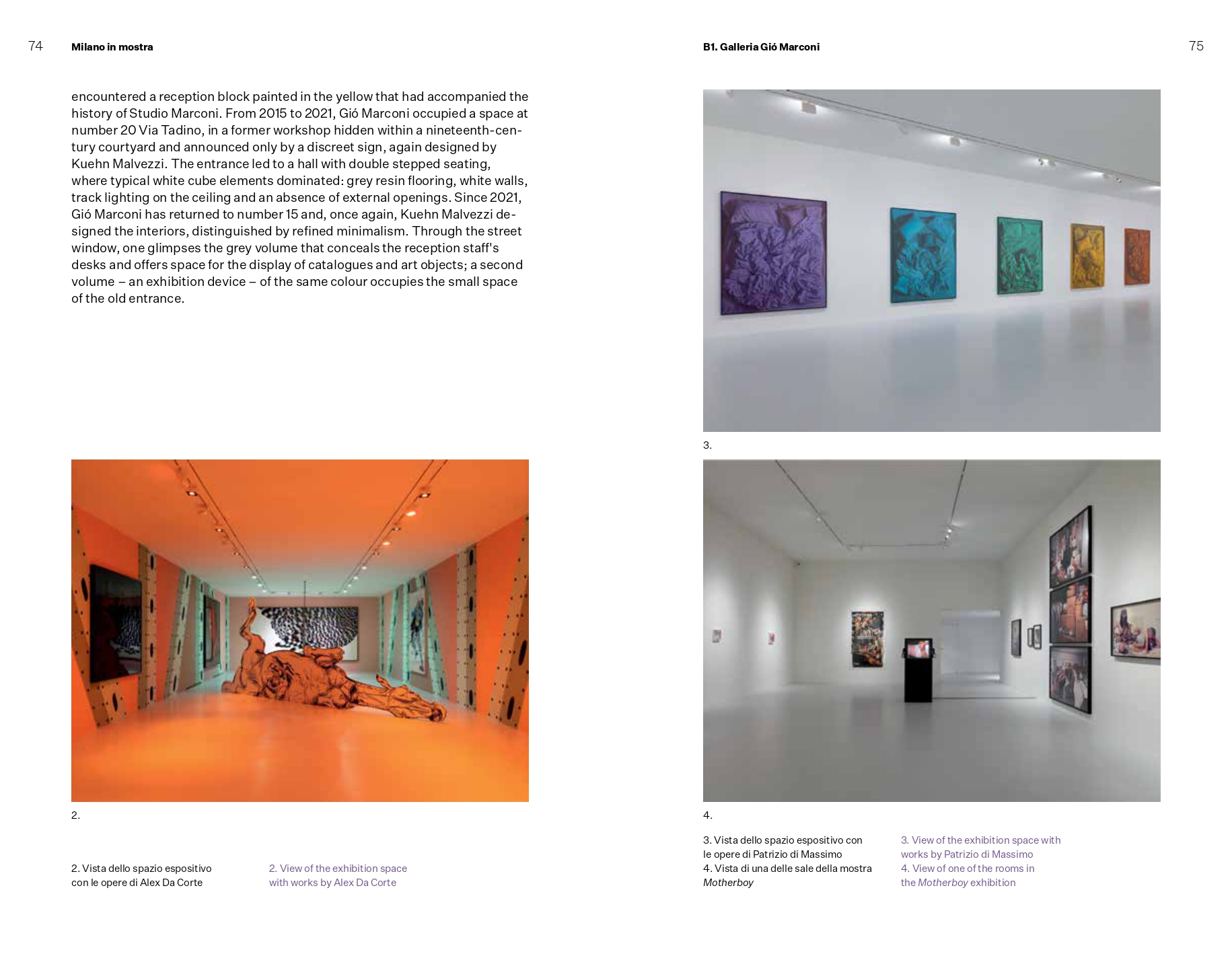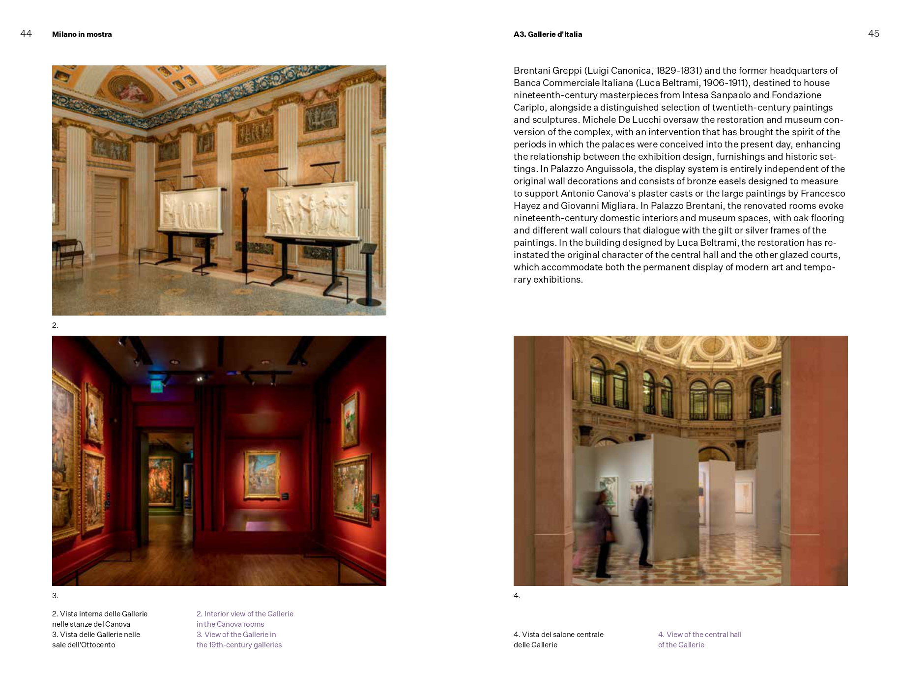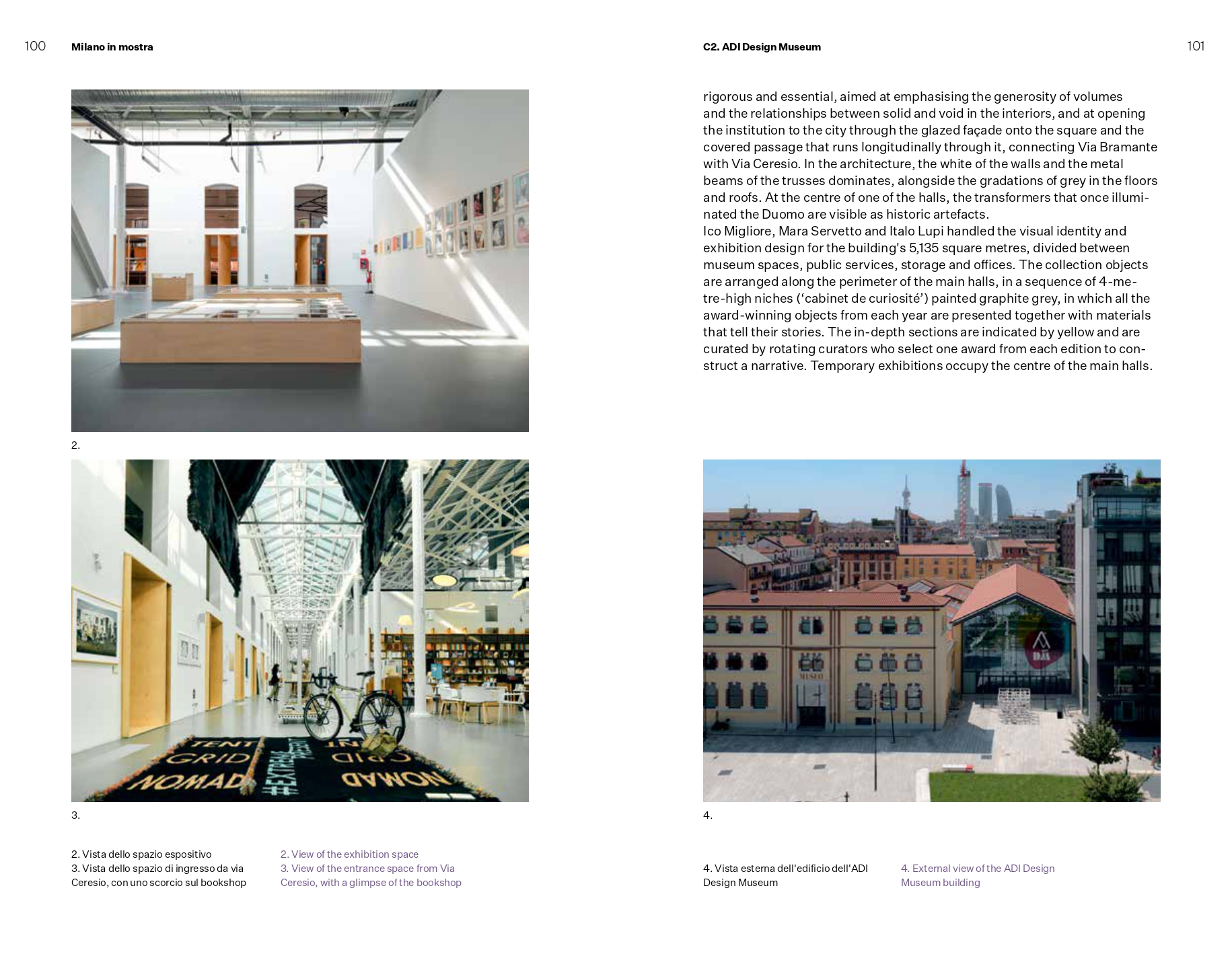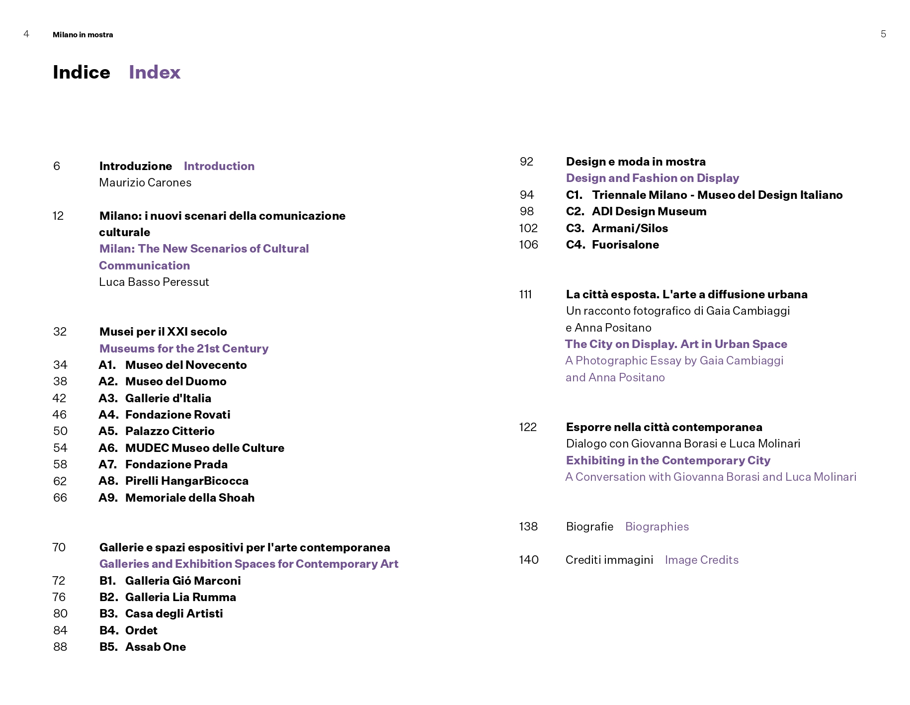 Il racconto fotografico La città esposta. L'arte a diffusione urbana, di Studio Campo, Gaia Cambiaggi e Anna Positano, restituisce l'immagine di una città che si mette in mostra ben al di là delle sue istituzioni, mentre il dialogo tra Luca Molinari e Giovanni Borasi sul tema dell'esporre nella città contemporanea, raccolto da Simona Galateo, chiude il volume. Completa la pubblicazione l'inserto/mappa a cura di Manuele Salvetti, che raccoglie una selezione a campione delle realtà espositive milanesi, suddivise in musei e istituzioni pubbliche, musei e istituzioni private e gallerie.
